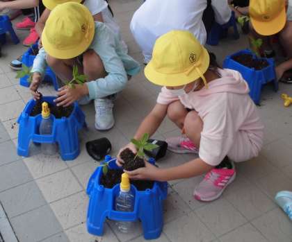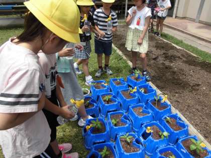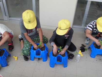 3年生の理科の時間です。ポッドで育てたホウセンカが大きくなってきたので,植木鉢に移植しました。大きく育つといいですね。