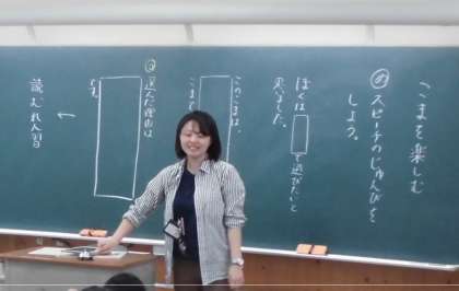 スピーチをするための原稿づくりをします。スピーチの雛型に自分の考えた文章を入れて,スピーチをつくります。