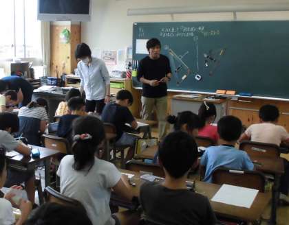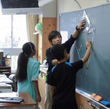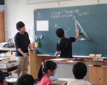 4年生の算数の時間です。一つの直線に対して垂直な直線を書く方法について,確認します。