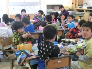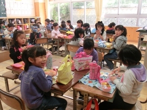 5月2日(木)は,ペア遠足の予備日になっていて,弁当の会食でした。それぞれの子が,保護者の愛情のこもったカラフルな自慢の弁当を見せ合いながら,楽しく会食していました。