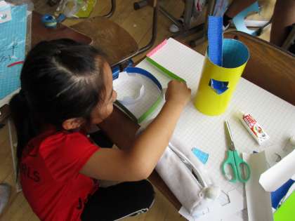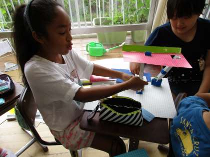 色紙や厚紙を切ったりくっつけたりして、ビー玉を転がす作品を作っています。