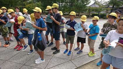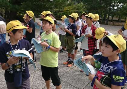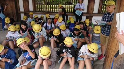 法隆寺見学中です。ガイドさんのお話を聞いて、みんな聞いたことをメモしています。かなり蒸し暑いですが、天気は良いです☀️