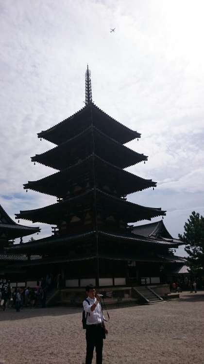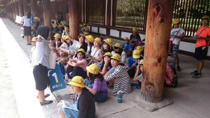 五重の塔と校長先生,そして見学する子どもたちの様子です。