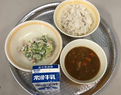 麦ごはん,牛乳,カレーライス,豆まめサラダ,福神漬け