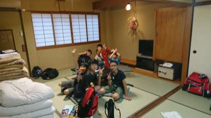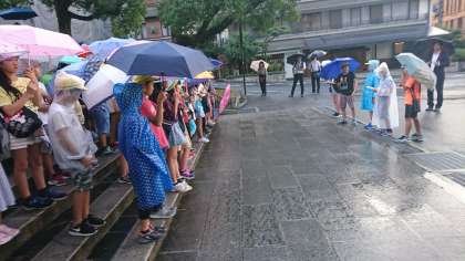 旅館に入って休憩した後、雨の中、到着式をしました。