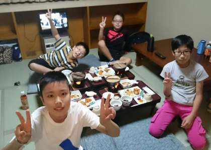 夜店後、おこづかい帳をつけています。夕食の準備もできました。