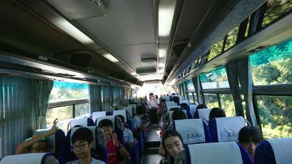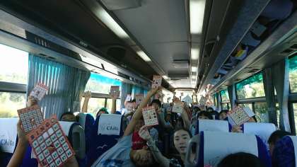 京都に向かってるバスの中です。ビンゴ大会を楽しんでます♪