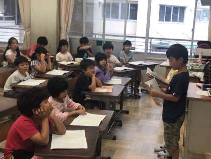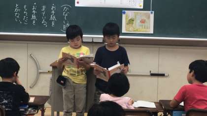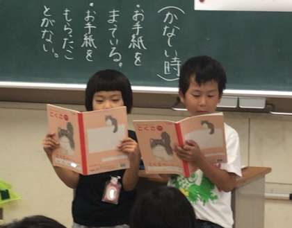 2年生の国語の時間です。がまくんとかえるくんの気持ちになって,二人で掛け合いながら音読します。