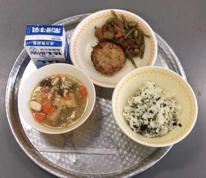 わかめごはん,牛乳,キャベツ入りつくね,五目きんぴら,みだくさん汁