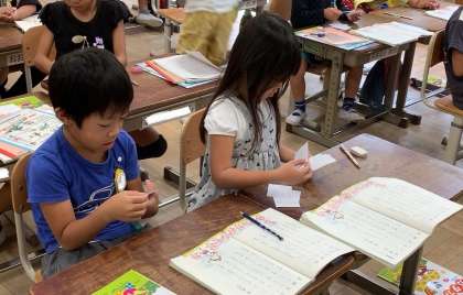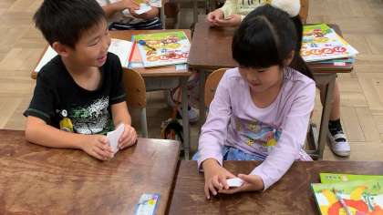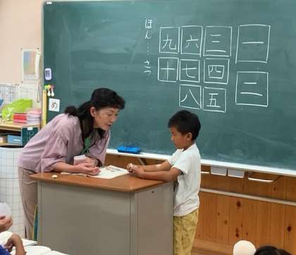 1年生の国語の時間です。漢数字を書いたカードを使って,数の数え方を学習します。