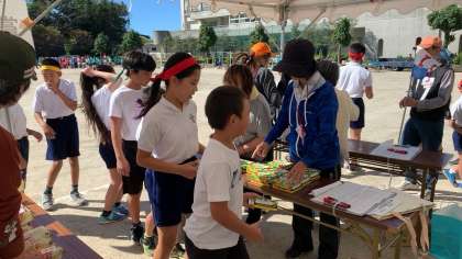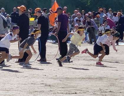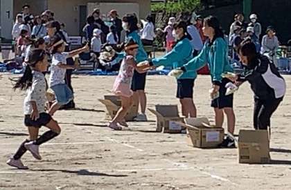 写真は賞品をもらう高学年の子どもたちと低学年種目の様子です。