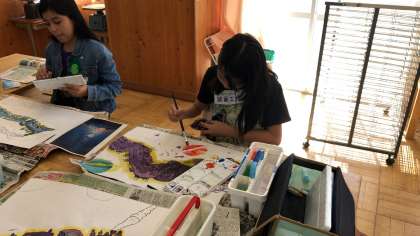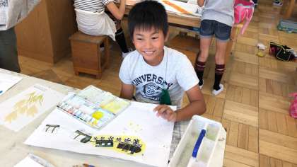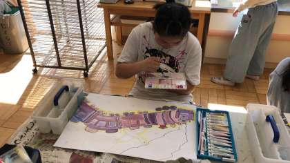 5年生の図工の時間です。宮沢賢治の「銀河鉄道の夜」の世界を絵に描きます。背景も少しずつ出来上がってきましたね。