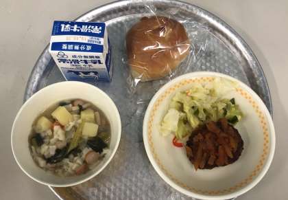 リンゴパン,牛乳,ハンバークのケチャップかけ,キャベツのサワー和え,米粉マカロニのコンソメスープ