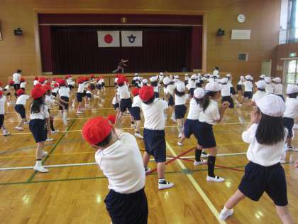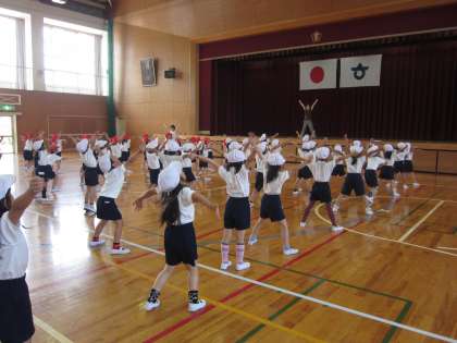 運動会の練習で踊りの練習をしています。初めての練習でしたが,子どもたちは,元気いっぱいすぐに覚えてしまいました。思いっきりジャンプしたり,力いっぱいポーズをとったり,一生懸命練習に取り組んでいます。