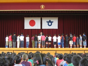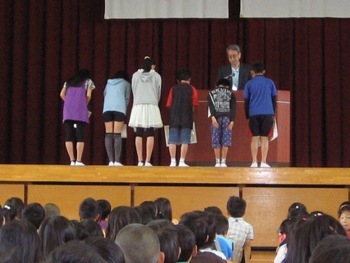 毎回、月曜日の朝会では、たくさんの児童が表彰を受けます。今回は、昨日の陸上大会の表彰を行ったため、いつもよりたくさん表彰をしました。