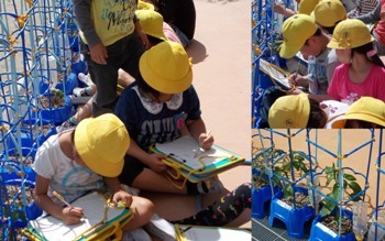 生活科の授業の一環として育てている野菜の観察をしました。大きく育って、大きな実をつけるといいですね。そのためには、しっかり世話をすることが大切です。水やりを忘れないようにしましょう。
