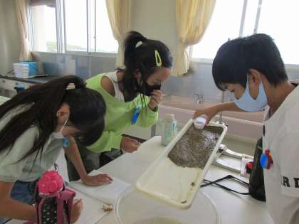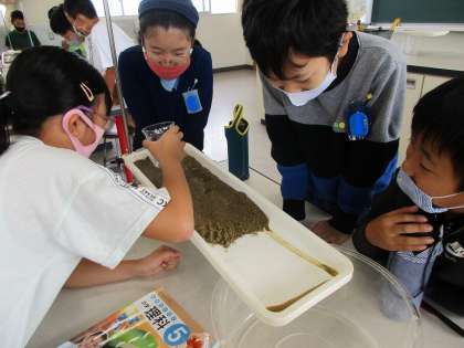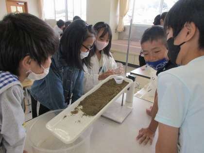 流れる水にはどんなはたらきがるのか,実験をして確かめました。少しずつ土がけずれて,積もっていく様子を確認することができました。グループでテキパキと実験に取り組むことができるようになりましたね。さすが5年生!