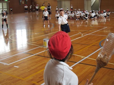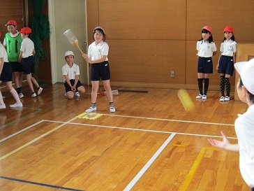ピッチャーが下投げでボールを投げて,ペットボトルのバットで打ち返す運動です。