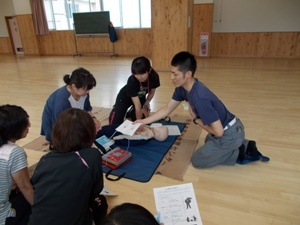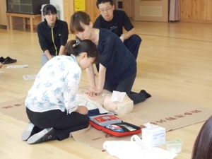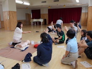 6月17日からのプールの授業に備えて、知多消防署から3名の方を講師に迎え、心肺蘇生の講習を受けました。