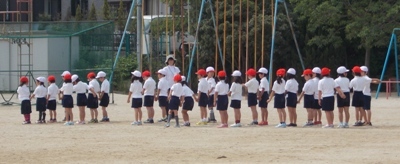 運動会を立派に行った1年生が、集団行動の練習をしていました。運動会でも練習しましたので、しっかりできていますね。