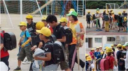 台風が近づいてくる季節になりました。子どもたちを安全に下校させるために、風水害避難訓練を行いました。