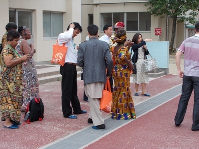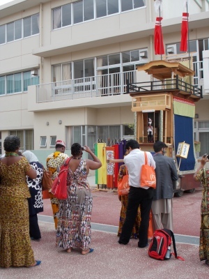JICAの方々が本校を訪問してくださいリました。玄関で、山車も歓迎していました。