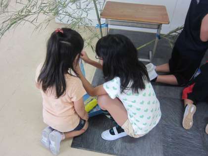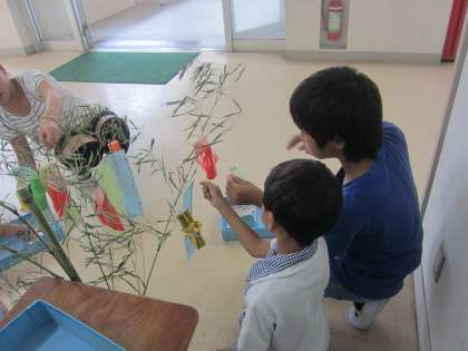 ペアのお兄さんやお姉さんと一緒に,たなばたの飾り付けをしました。「願い事になんてかいたの。」「将来の夢をかいたよ。」と会話しながら,楽しく飾ることができました。