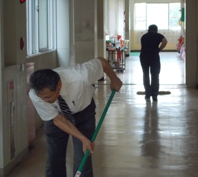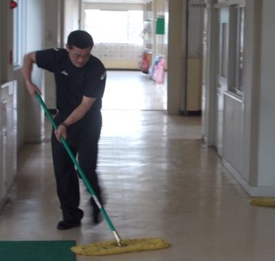 そのため、中館1階廊下が滑りやすい状態になりました。大放課の前に、モップをかけ、水分を取りましたが、すぐにまた、ベタベタになってしまいます。