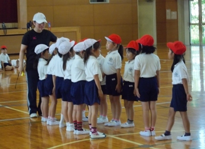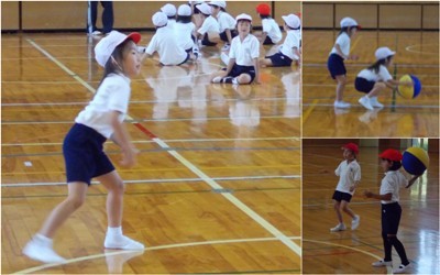 体育館も暑いので、水筒を持ってきて水分補給をしながらの体育です。