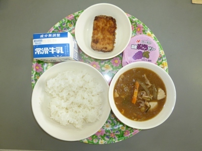 雨が続いたので少し涼しくなってきました。今日の献立は,ごはん,牛乳,ぶたじる,チキンのたつたあげ,ぶどうゼリーです。涼しくなってきたので,温かい汁物がおいしく感じるようになりました。野菜をたくさん食べることができましたね。