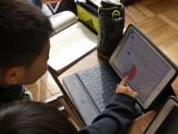先日、6年生は国語、算数、理科の全国学力・状況調査テストを終えたところですが、今日は質問に対する回答をタブレットを使って行いました。