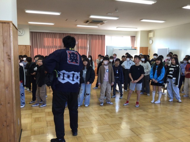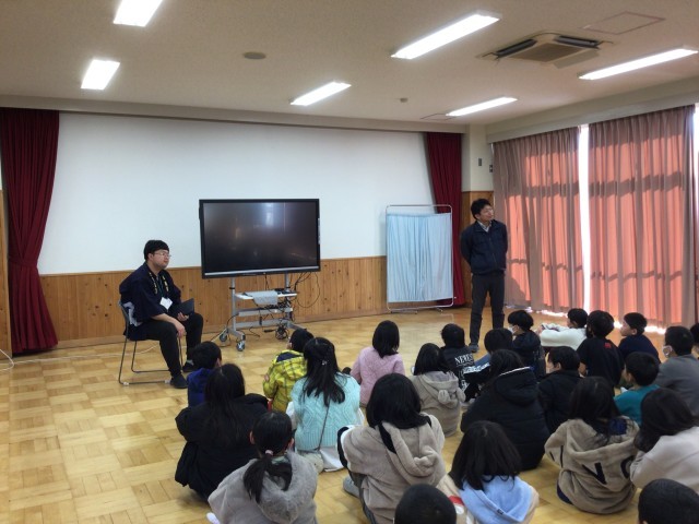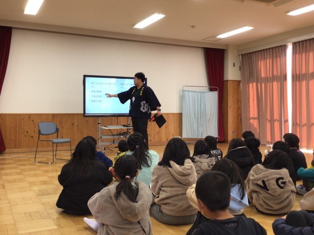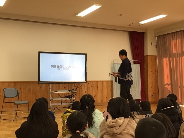 4年生 社会科単元「わたしたちのまちに伝わるもの」から、知多の岡田で行われている「岡田春まつり」について特別授業を学年で行いました。