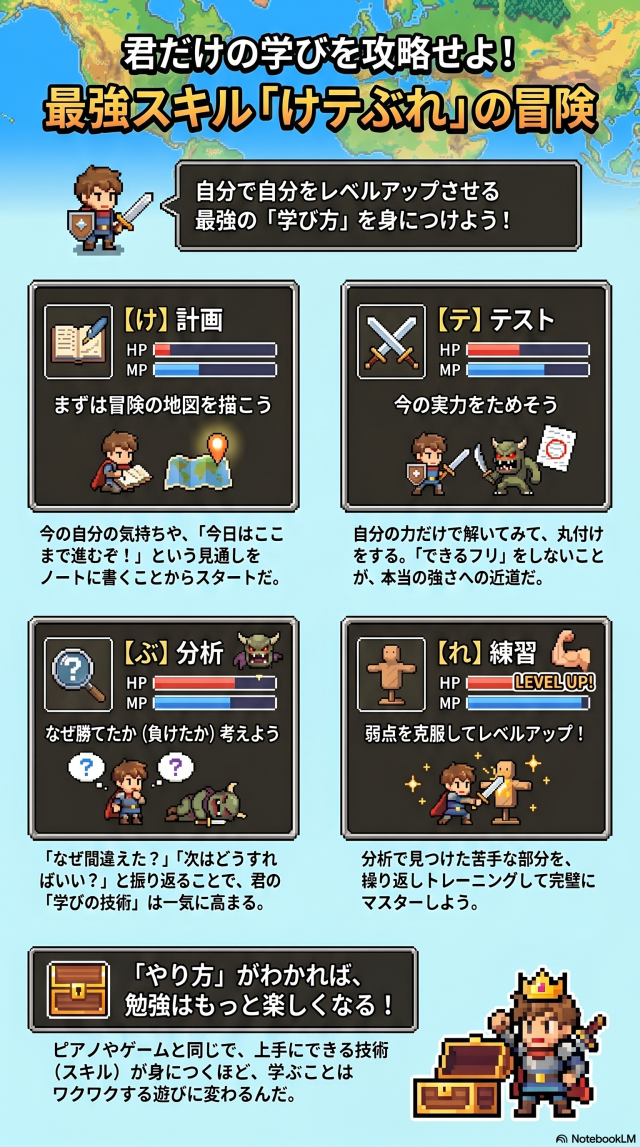 「計画」「テスト」「分析」「練習」のそれぞれの頭文字を取って、けテぶれといいます。
