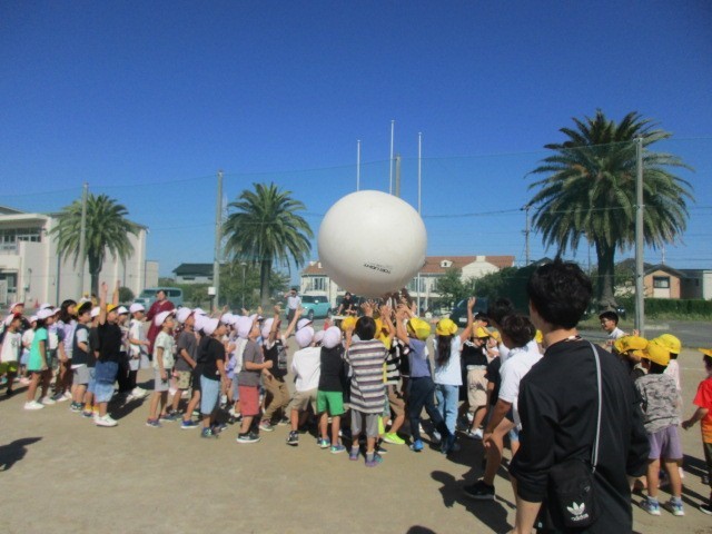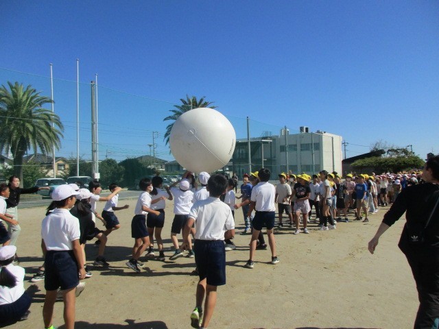 そして、順に大玉を送っていく練習をしました。途中、大玉がコースをそれてしまうこともありましたが、元の位置に戻し、見事ゴールしました。