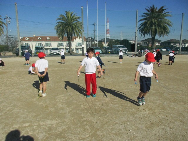 運動場では、1年生と5年生が縄跳びの練習をしていました。