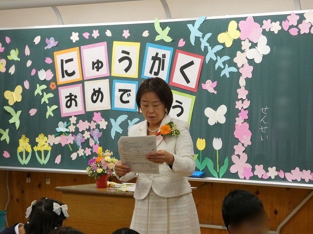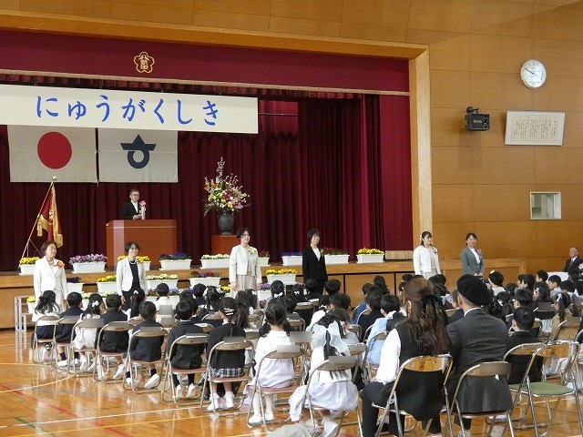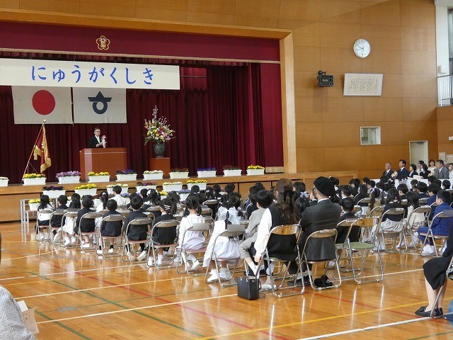 校長の式辞、教育委員会のお祝いの言葉の後、新6年生の代表の子が新1年生を歓迎するスピーチを行い、最後にみんなで校歌を歌いました。