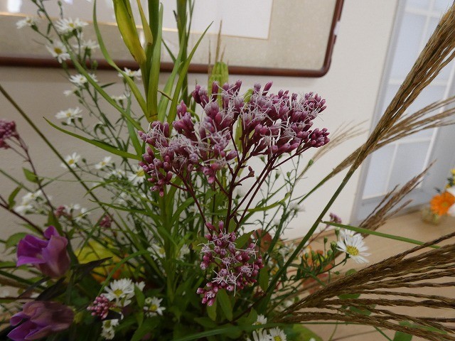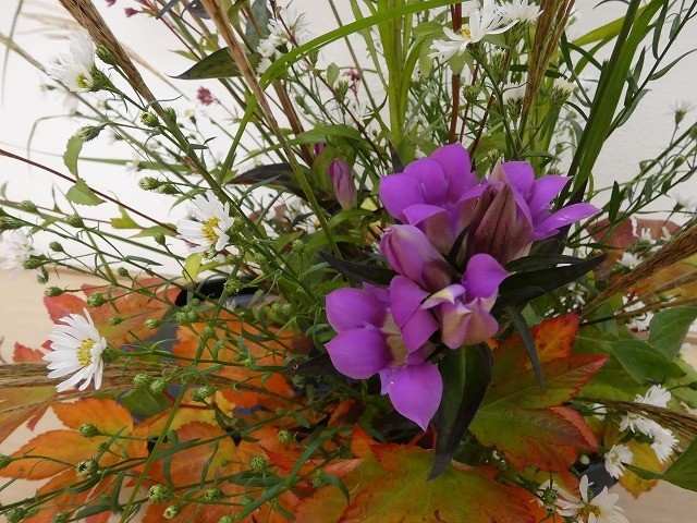 尾花、百合の実、藤袴、竜胆(リンドウ)、孔雀草、木苺、クレマチスです。