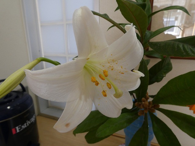 今週のお花は、写真1枚目が、鉄砲百合、枇杷、ガーベラです。
