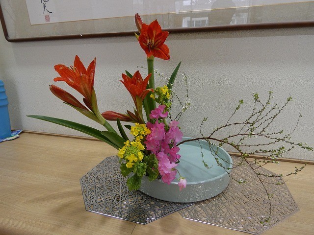 一枚目は、アマリリス、ユキヤナギ、菜の花、スイートピーです。