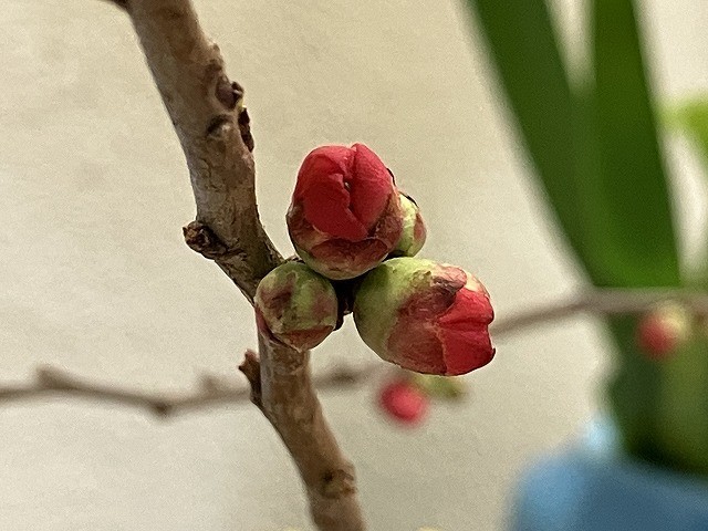 三枚目の写真にある木瓜は、果実が瓜に似ており、木になる瓜で「木瓜(もけ)」とよばれたものが「ぼけ」に転訛(てんか)したとも、「木瓜(ぼっくわ)」から「ぼけ」に転訛したとも言われるそうです(Wikipediaより)。バラ科の植物なんですね。