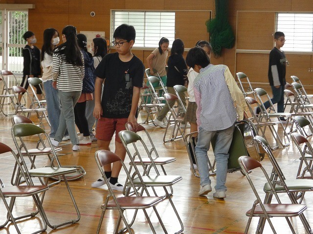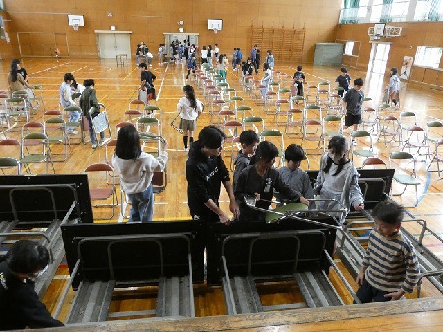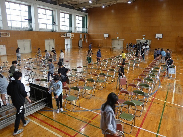 体育館の椅子を並べたり、名札や書類を並べたりするなど、進んで仕事をしていました。