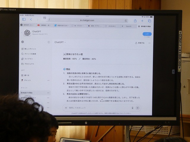 そして、子どもたちが調べたことを生成AIに読み込ませ、信長か秀吉のどちらの家来になりたいかを数値(%)で回答させます。
