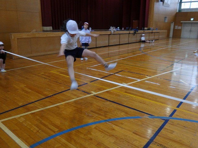リズミカルな助走から、力強く踏み切って跳ぶ練習をしていました。