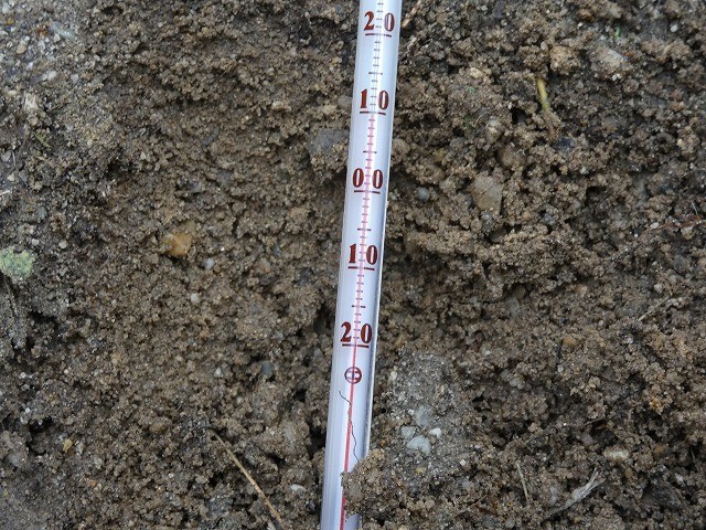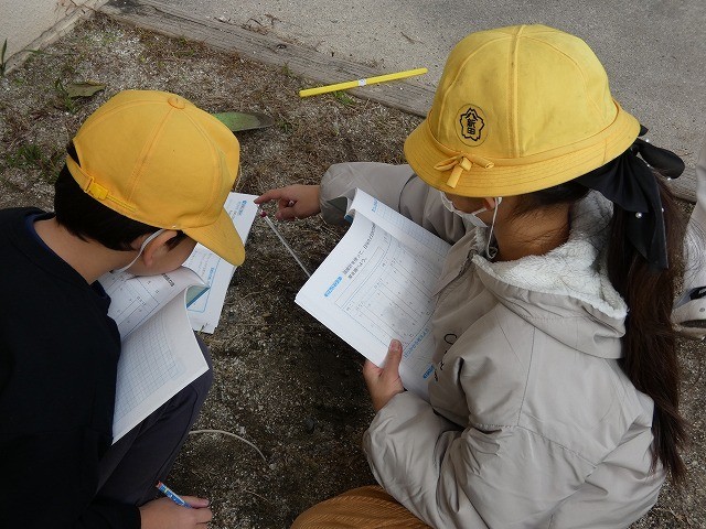 子どもたちは、9時半頃と12時頃に、外に出て日なたと日かげの地面の温度を計測していました。