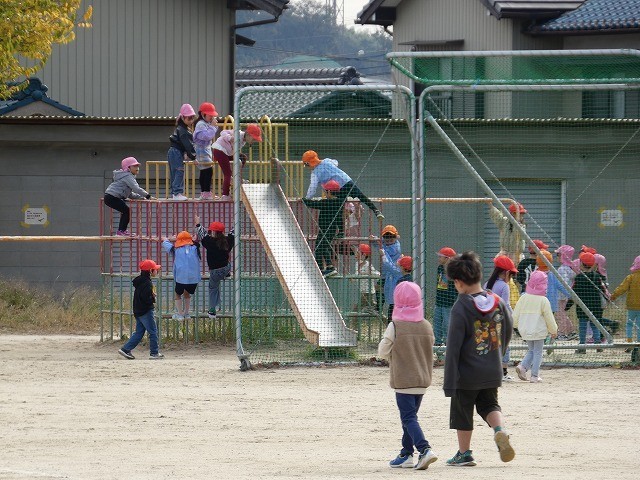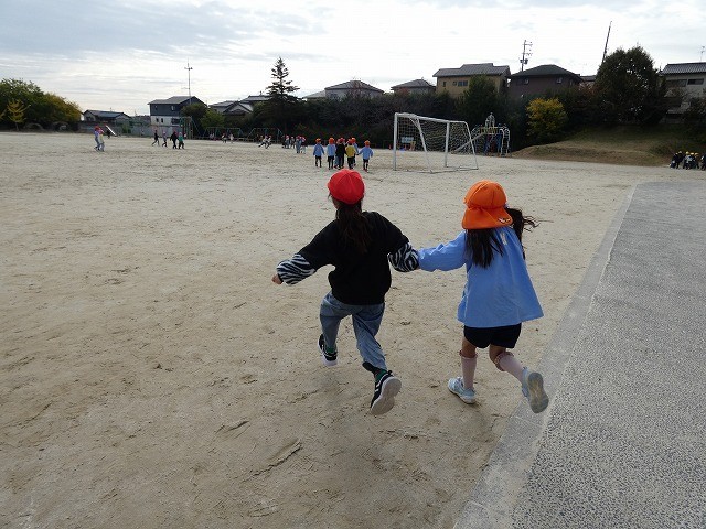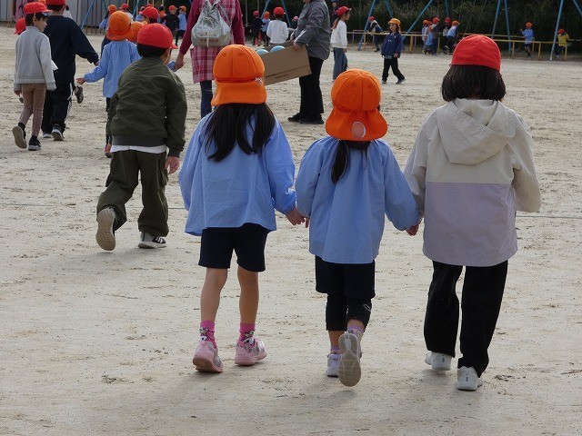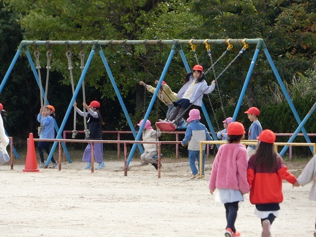 1年生の子どもたちは、園児たちを連れて、一緒に外遊びをしました。