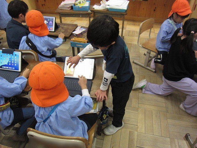 その後、教室では、生活科で作った秋のおもちゃで一緒に遊んだり、タブレットで一緒に遊んだりしました。