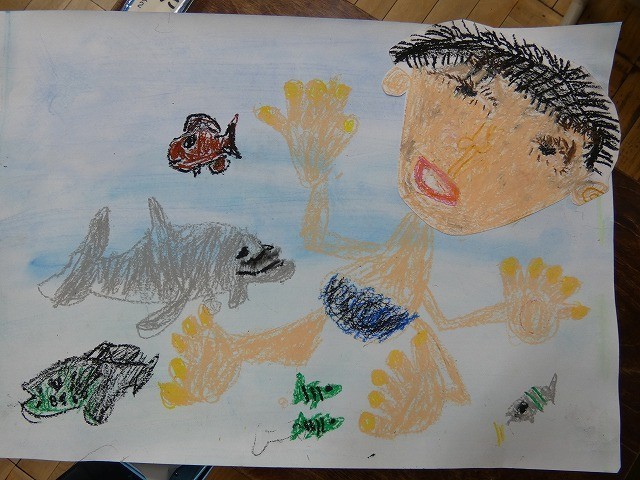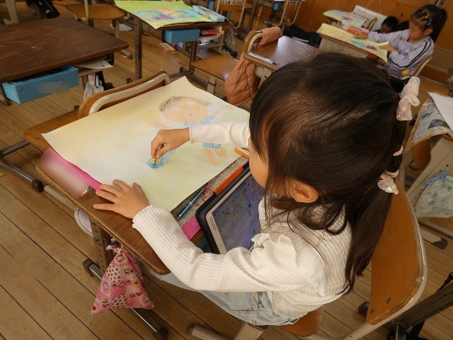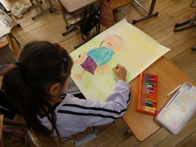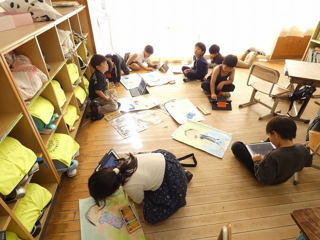 子どもたちは、場面の構図や人物の動き、大きさなどをよく考えて描いていました。