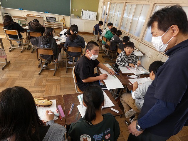 子どもたちは、場面の構図や人物の動き、大きさなどをよく考えて描いていました。