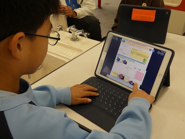 しおりに書いた自分のメモとパンフレットを見ながら、タブレットを使ってまとめています。