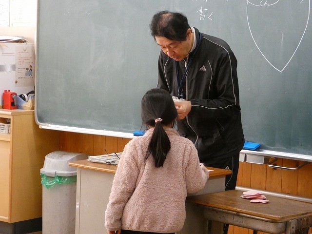 2年生がハート型マークの紙に、ペンで文を書いていました。